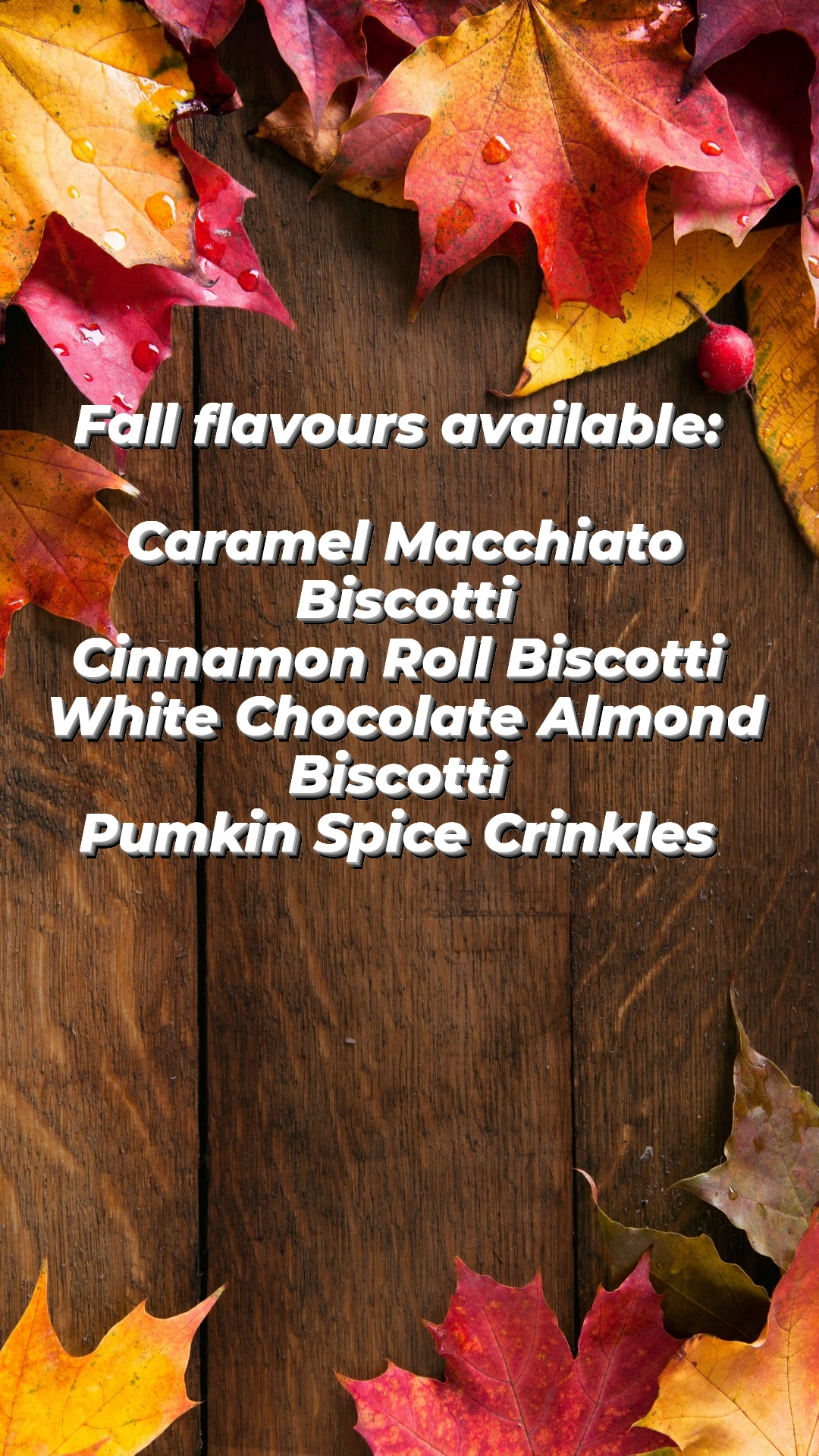 Fall flavours availableStefania ManzoSep 23, 20221 min readCaramel Macchiato BiscottiCinnamon Roll Biscotti White Chocolate Almond Biscotti Pumkin Spice Crinkles